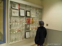 | Max looking at all the different types of milk bottles. |