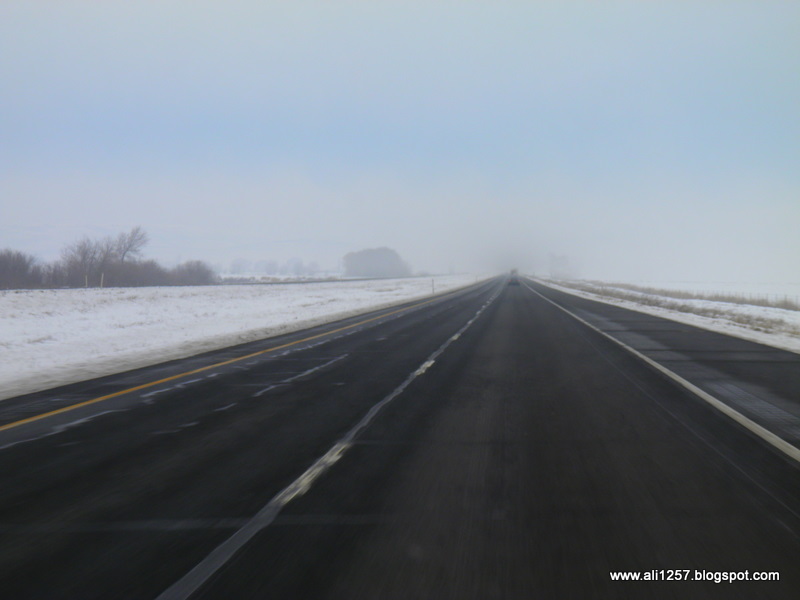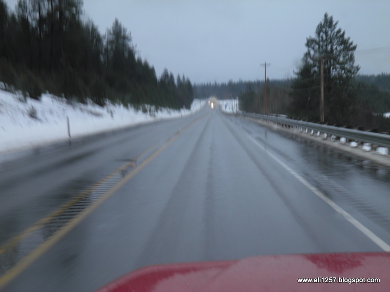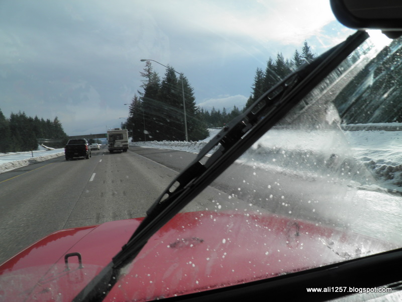 | Lots of snow on the side of the road, but the roads were bare and sometimes it rained a little. |