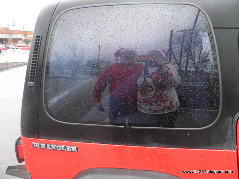 | Wanting a picture of us together on Christmas Day I used the window of the Jeep as a mirror. It is fuzzy but it works. |