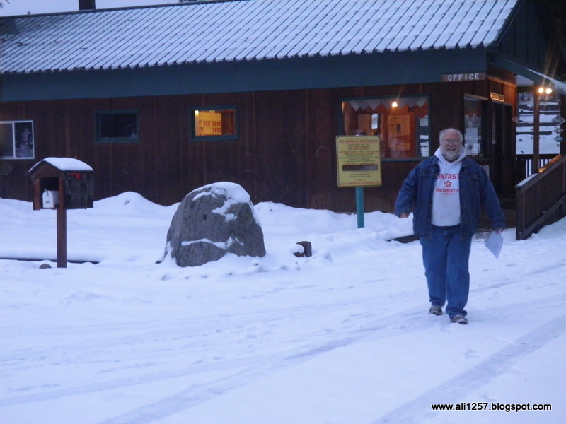 | Ron heading back to the motor home after getting us checked in. Lots of snow on the ground. Glad we have electrical hookups so we can use our little heater. It is supposed to be down into the 20’s tonight. |