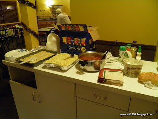 | And the food: chicken & cheese casserole, spaghetti noodles & sauce, bread with butter, milk and chips. |