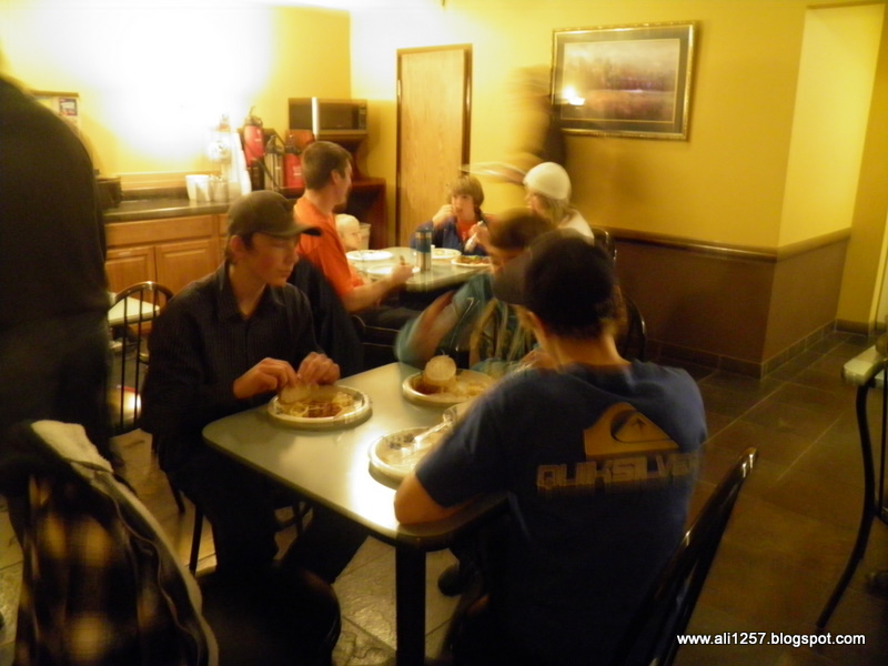 | The whole group eating dinner. We took over the breakfast area in the hotel. |