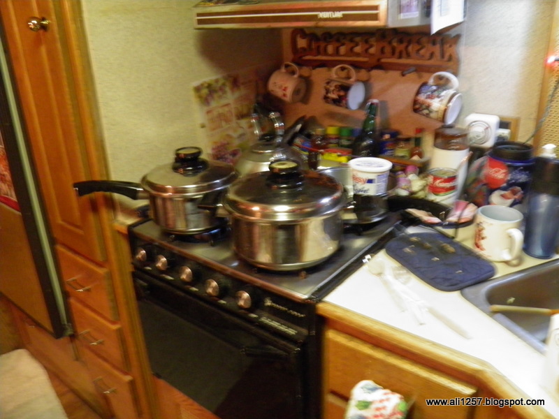I said I was making a chicken & cheese casserole. Did they want me to make a couple of extra casseroles for the teams. SURE was the reply we got back. So after discussing the situation with Ron we made a stop at Wally World and bought stuff to make spaghetti, garlic bread, salad, milk and of course the boys would need a snack for later in the evening so we bought chips and oranges. And then we went to the motor home and did some cooking!