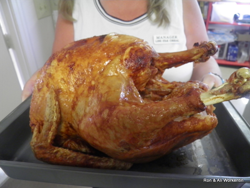 Now isn’t that one pretty turkey. I put it on the counter in the motor home and let it sit while I closed up the office. Once the office was closed I made a Risotta (type of rice) dish with Italian seasoning to enjoy with our turkey. Both of us exclaimed “delicious.” The turkey was so moist, melt in the mouth and filling. After dinner Ron de-boned the turkey. We ended up with enough meat for at least four meals all for less than $6.