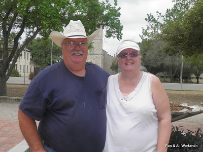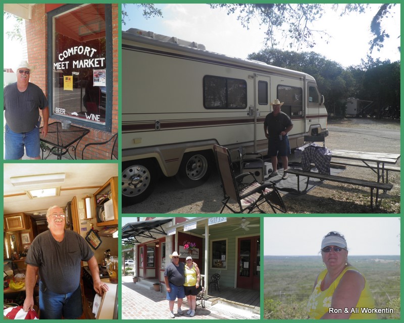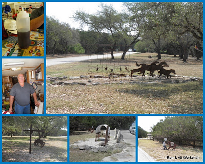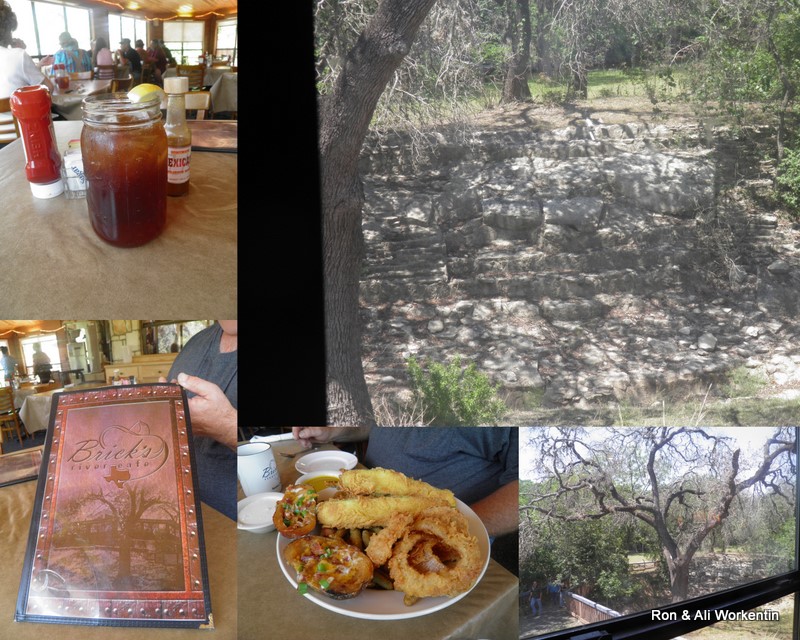 Stopped for lunch at Brinks Cafe in Bandera, TX. They serve ice tea Texas stytle in a quart mason jar. We had a beautiful view from the window…if they were to get rain this would be a beautiful waterfall. And just look at the size of those onion rings. Also on that sampler plate was huge slices of zuchinni, cheese sticks and jalapeno slices called bottle caps. There were also these bright red bottle caps that I, Ali, thought were carrot slices, nope, red peppers and boy were they HOt!!!