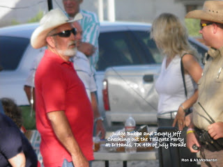 I have been sick the last few days.  This evening feeling a bit of cabin fever we decided to go into D’Hanis for the annual 4th of July Parade.  It went in front of the Country Mart, past the bank and local B&B and then around the block and down the main road for about a half mile and then turned to go down one of the side road and then back to Bill & Rosa’s and the Country Mart.  We met Judge Bubba – he was out greeting the citizens of D’Hanis also Deputy Jeff.  Someone was hosting a free hot dog feed but we decided to head back to the motor home.  I was wiped  out.  Below is a movie of the parade.  And a picture of Judge Bubba and Deputy Jeff.