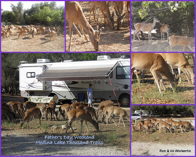 Below is a collage of pictures (thanks Rick for me how to do this) of the many deer roaming through the park.  Many people pick up deer corn and feed them.  We heard one little boy say he counted 32 deer and Hank stopped counting when he hit 70.  It is not easy to keep track of them as they kept moving trying to get corn.  Some of the larger bucks could get quite mean, shoving the does and fawns out of the way.