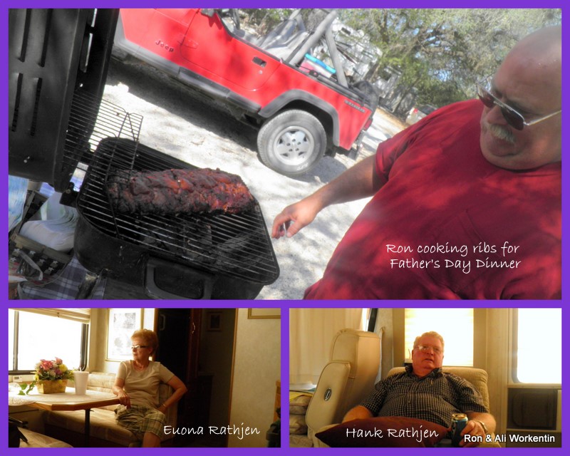 Saturday evening we bbq’d ribs and Euona made potato salad, coleslaw and corn-on-the-cob.  It was a great dinner and  of course, more visiting. Below is Ron grilling those ribs and Hank and Euona as we visited in their rig.