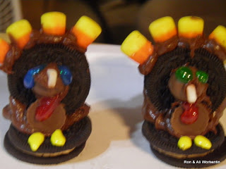 So I bought Oreos, fudge frosting, candy corn, colored writing frosting and gel and malt balls. And set to work. I made thirteen of these little guys. Eleven for our Thanksgiving table and two for Bonnie as a treat.