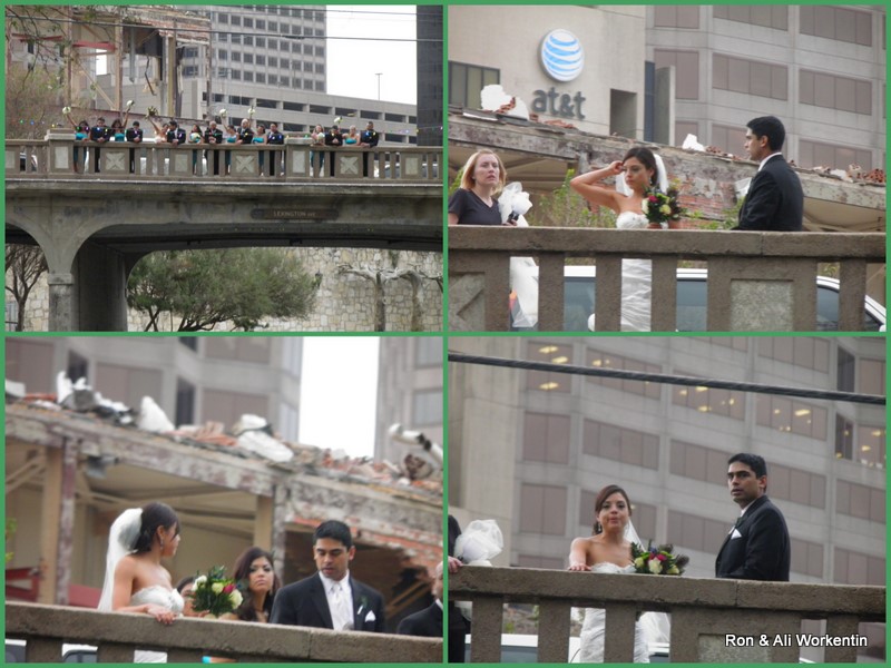 A couple and their wedding party on one of the bridges over the Riverwalk.