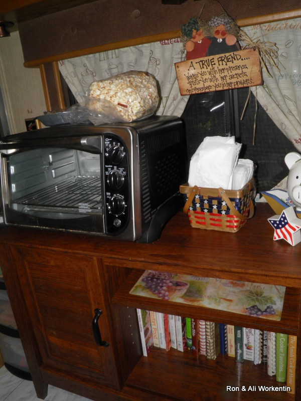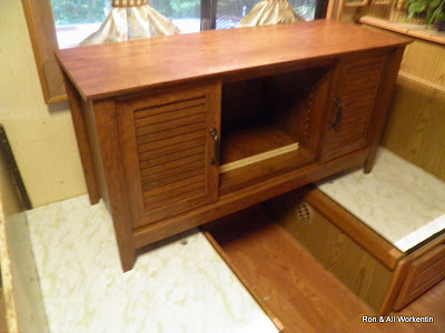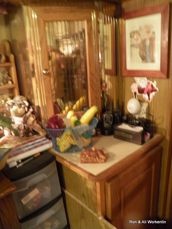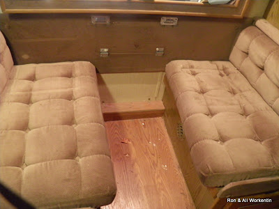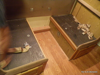 We talked about cutting down the benches giving more room for walking in the rig.  But wait we need the back of the bench by the door ~ it has electric outlet in it, holds the banister for climbing into the motor home, holds the magazine rack.  Oh, and we use it to balance when stepping out of the rig.   And then it was time to go work ~~ all the above happened before 8:00 a.m. 🙂