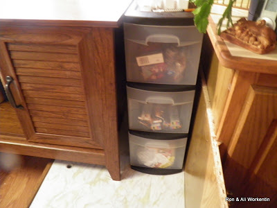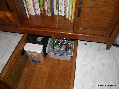 Stuff under the middle of the cabinet.  Will be buying a couple of baskets to slide under there instead of having stuff just tucked under there that can roll around when we are on the move.