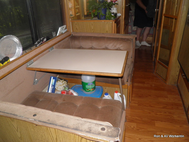 This is the dinette area with the table & benches cleaned off and a glimpse of stuff underneath.