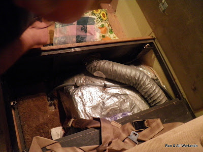 And under the other bench ~ the wheel well, furnace ducting and more electric outlets.  Ummm, now what???