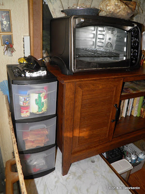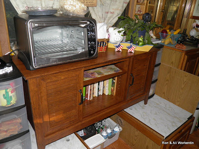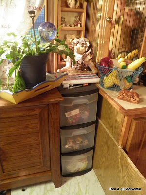 So we talked some more, discussed Plan C and came up with getting a cabinet for across the benches, giving us a little storage under the center cabinet.  And so off to Walmart we went.  Bought a cabinet and a file cabinet with two wood drawers.  In the boxes they looked the same color.  Also bought new curtains for the kitchen window and the window behind where the dinette was.  I went back to work leaving Ron to do some demolishing and building.