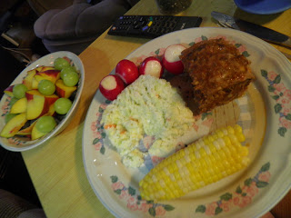Have been trying to cook healthy meals: fruit salad, coleslaw, radishes, corn-on-the-cob with  meatloaf:)