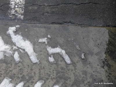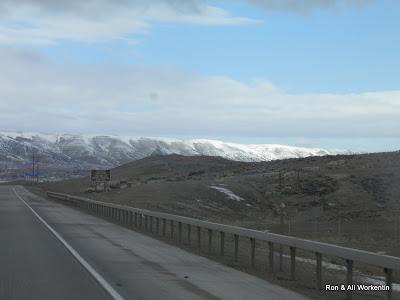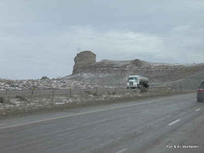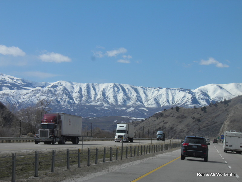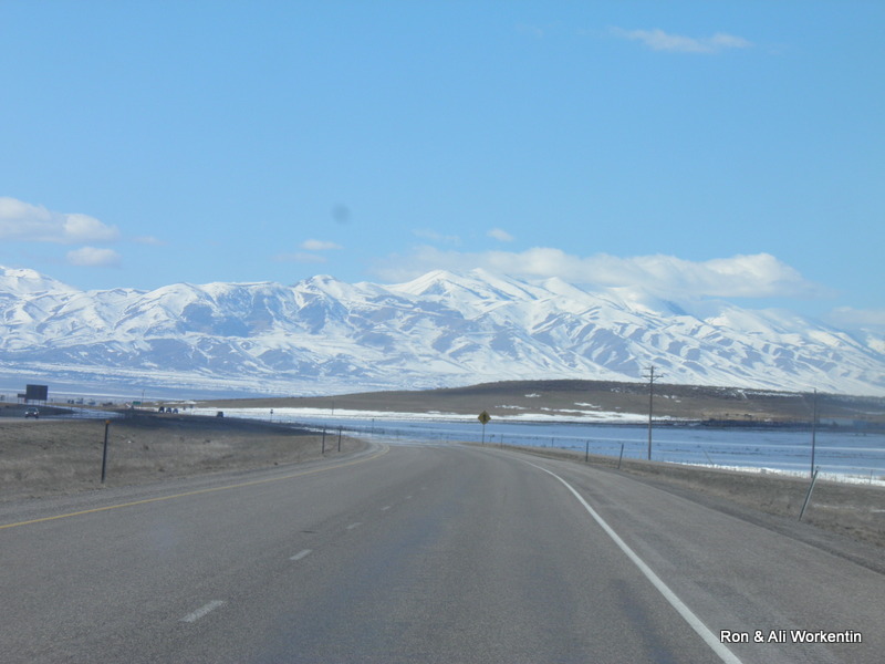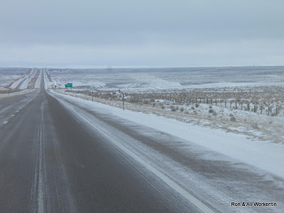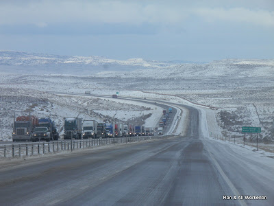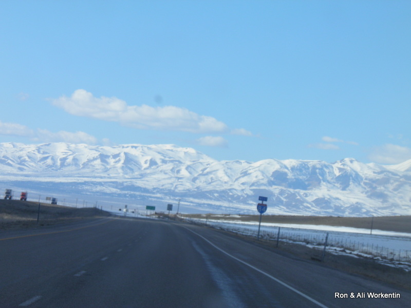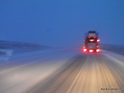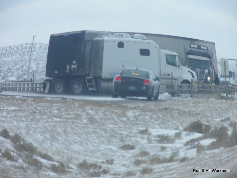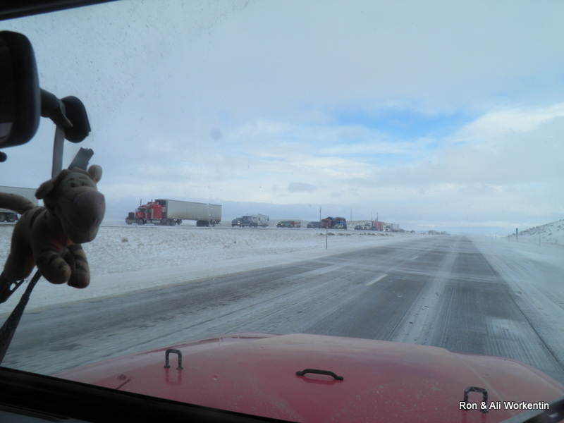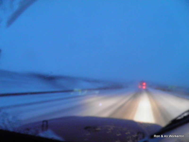 We crossed into Iowa in the dark and began to discuss where to stop for the night. As it was raining when we were headed through Nebraska Ron suggested checking weather conditions and found that a blizzard was due to hit in Laramie, Cheyenne & Rawlins, Wyoming and we decided to try to beat the blizzard before stopping. And so we continued to drive in the rain and then it turned to sleet, snow and ice. I, (Alice) tried to sleep a little so I could have my turn at driving and was dozing off when the Jeep started sliding, Ron was saying “whoa, whoa, whoa” and I began saying “Thank You Jesus” over and over again as we were slipping, sliding and swerving. God was with us as there were no other cars on the road and the ditches stayed on the side of the road. Ron is a great driver and got us out of the spin and we continued on our trip. This is what the roads looked like at the time of our spinning, slipping and sliding!