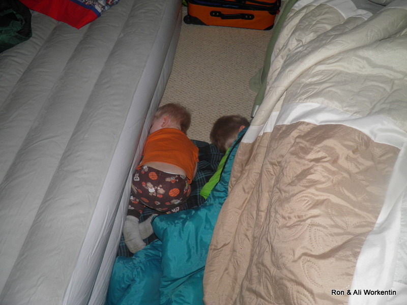 | This is where we found Treyson & Christopher Tuesday morning. They started out on the air bed (thanks Mr. Jim for setting it up) and ended up on the floor between the air bed and our bed. Seeing Treyson sleeping like this reminds me of how his Daddy (Brandon) used to sleep at this age. |