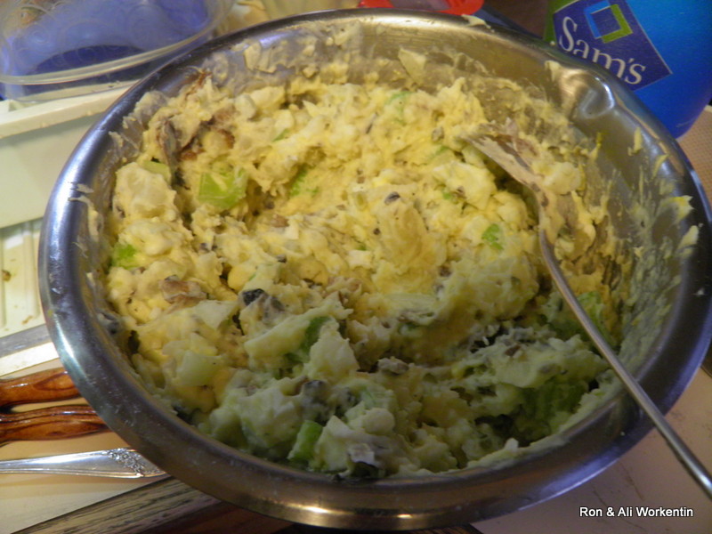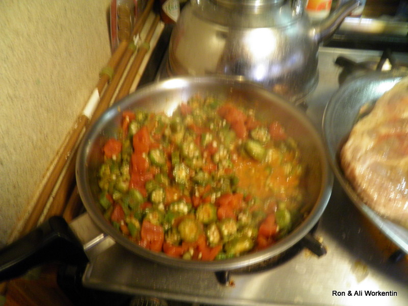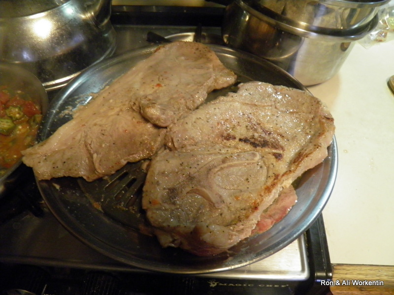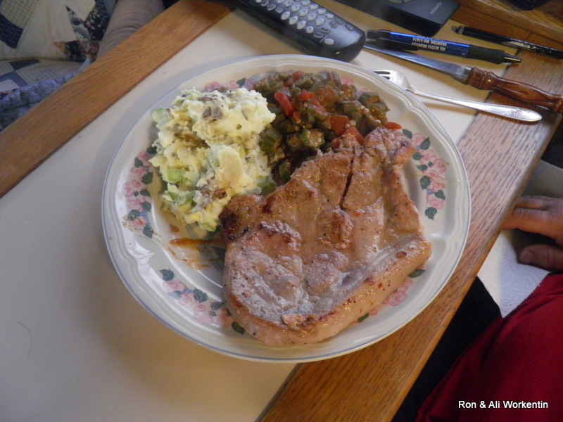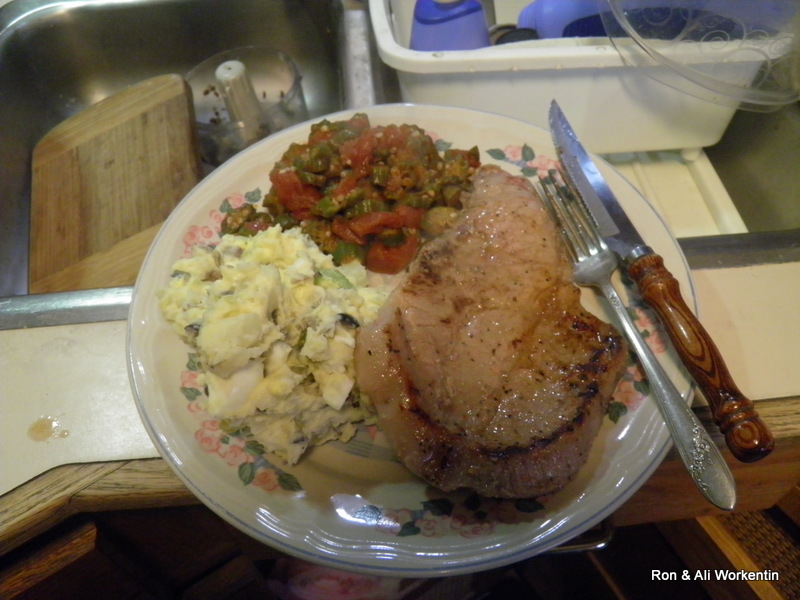 Okra w/tomatoes, homemade potato salad and grilled pork steaks.