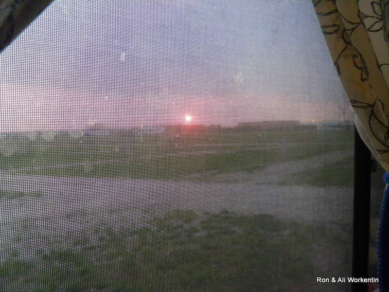 One morning shortly after Ron left for work and I was sitting on the couch having my quiet time, the sun started to peak up above Amazon so I snapped a picture through the window/screen. The picture doesn’t do it justice and next time I will venture out of the rig to take the picture 🙂
