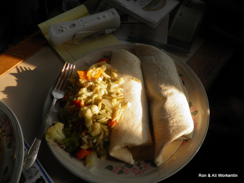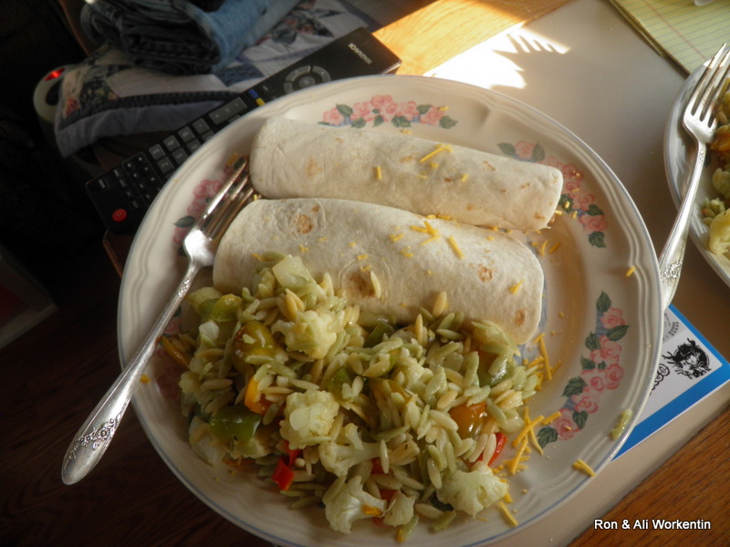 And our dinner one evening: soft tacos w/Tilapia and cheese and orzo with red, green, yellow bell peppers. These are Ron’s 🙂