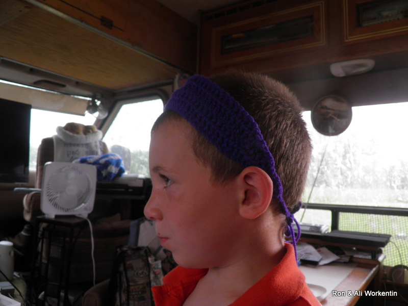 And this is Malachi modeling one of the headbands I have recently made. Hard to tell but the color is purple not the blue it looks like in the picture.