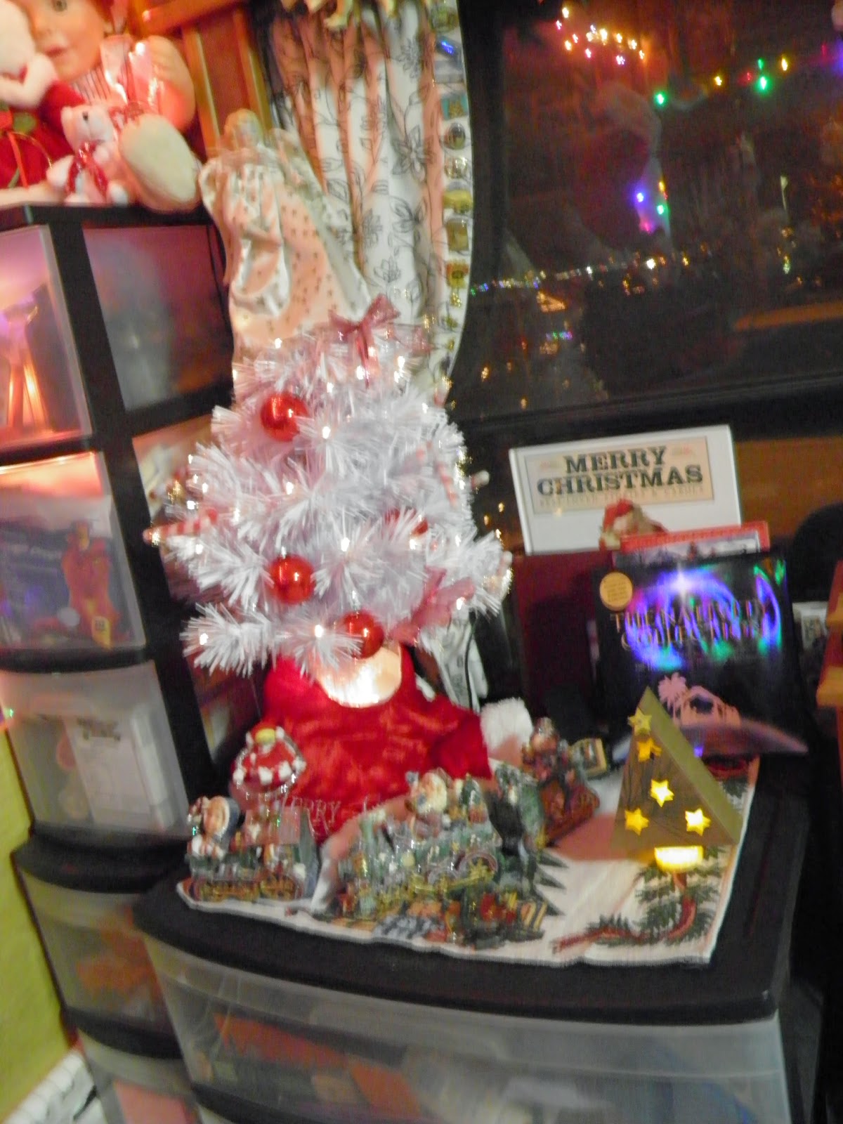 Close up of our white & red tree. Train in front was a gift last year to Ron from a friend.