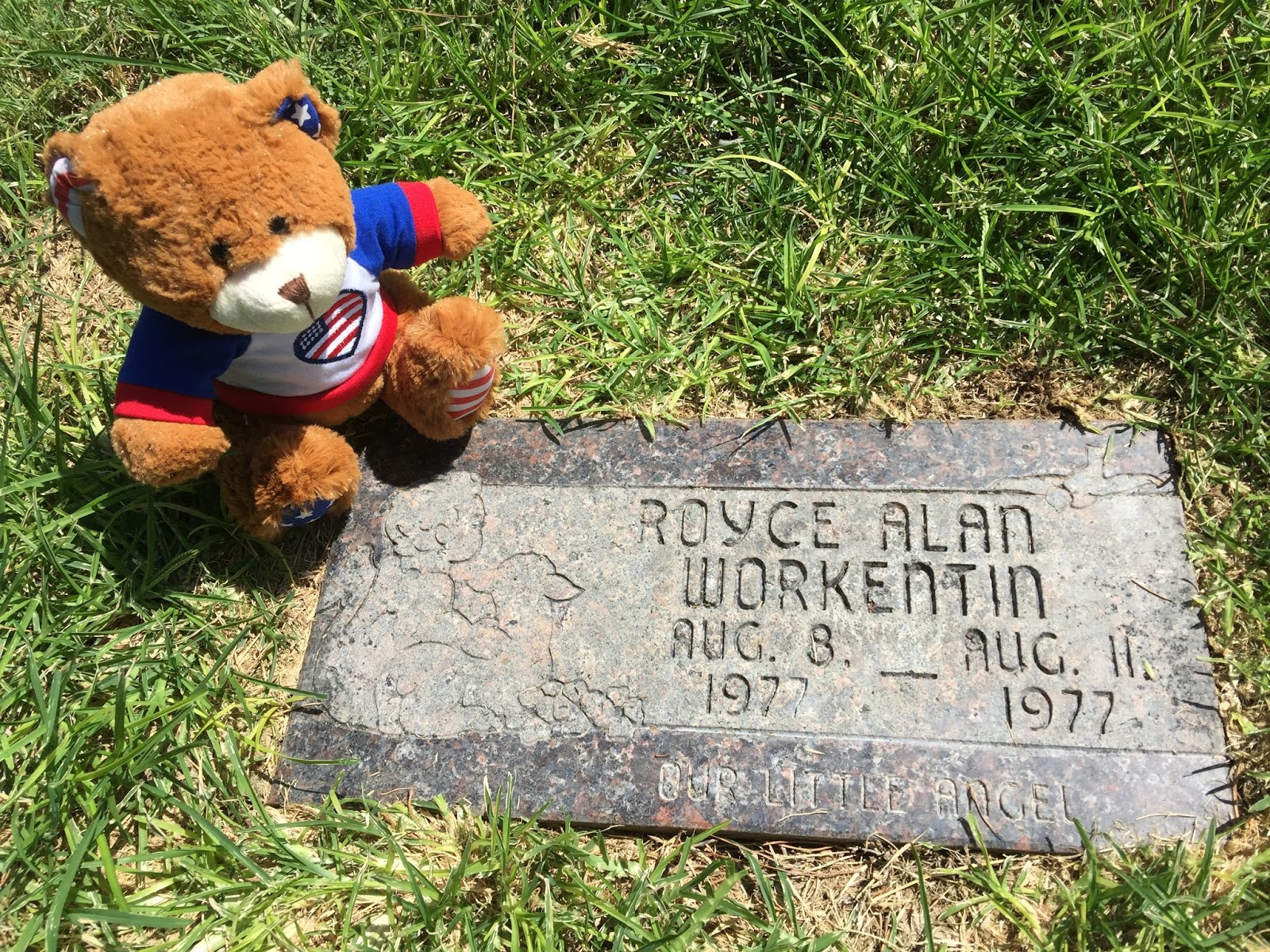And then this past week, Brandon was in Las Vegas for a conference. I had asked him if he could take flowers or a balloon to put on Royce’s grave. And then told him never mind as we were having internet problems so I couldn’t find the address of the funeral home…but Sunday night, August 9 we got an email from him with pictures. He had found out where Royce was buried, couldn’t find a balloon or flowers but found a darling Teddy Bear and took it to the cemetery and placed it on his brothers grave, a brother he never knew, and took a bunch of pictures for us.