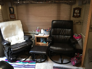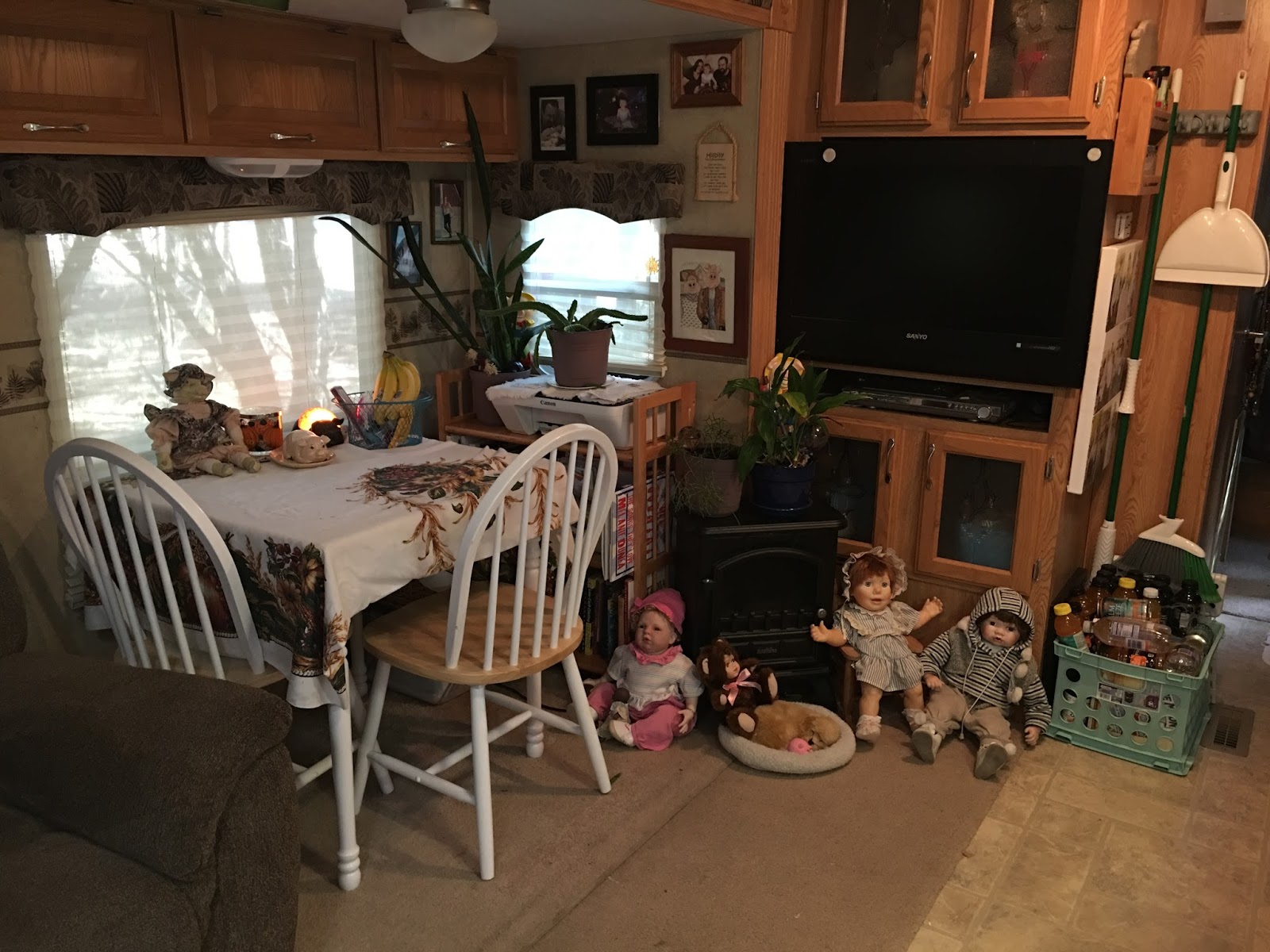 Also, the babies have their home in front of the fireplace (we can heat the whole trailer with this little fireplace; the fireplace was used often in our motor home when we purchased it in Missouri).