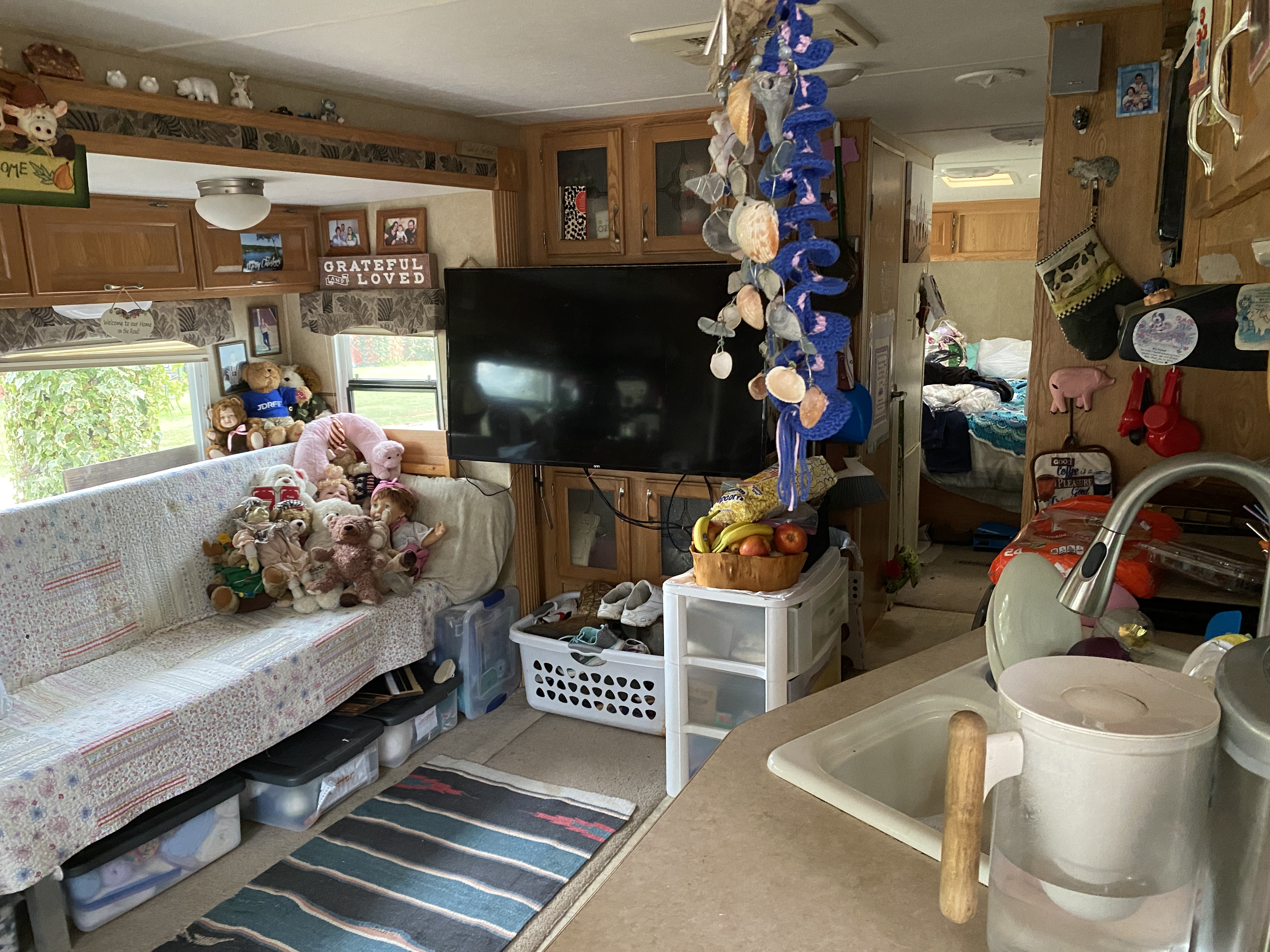 if you look closely you can see 4 of the 6 yarn totes! 🤣 to the left of the trailer is a grassy area then just a short walk to the office/pool area