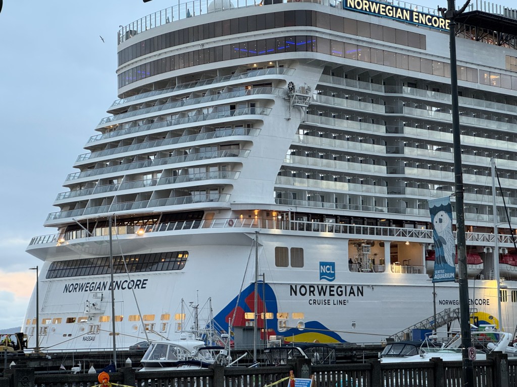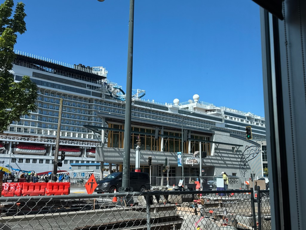 Up early even though we could have slept in since we didn’t have to board until Noon! Suitcases, backpacks and snack & coat bag are packed. First look at the Norwegian Encore!!! This was taken out of our room window.