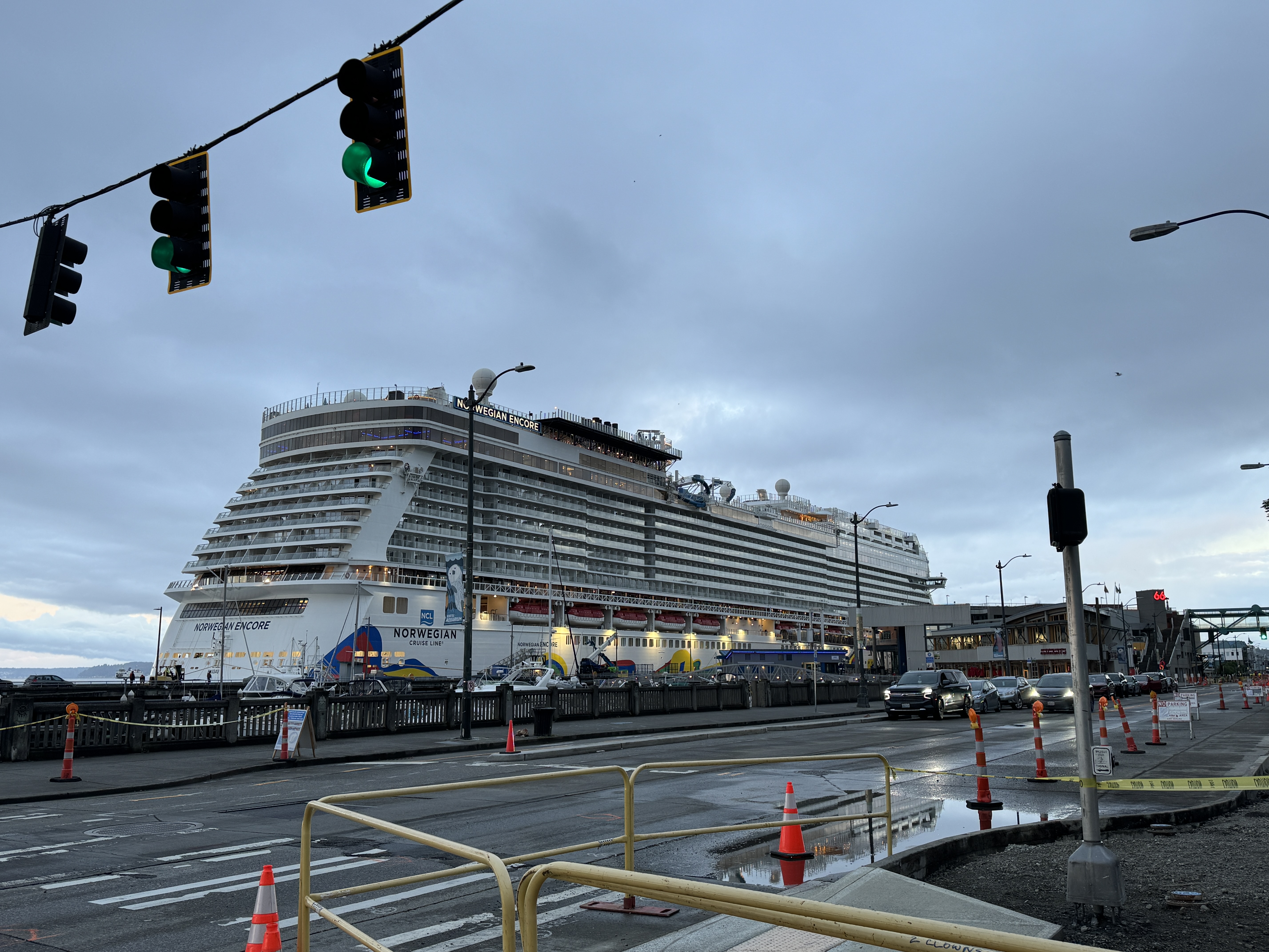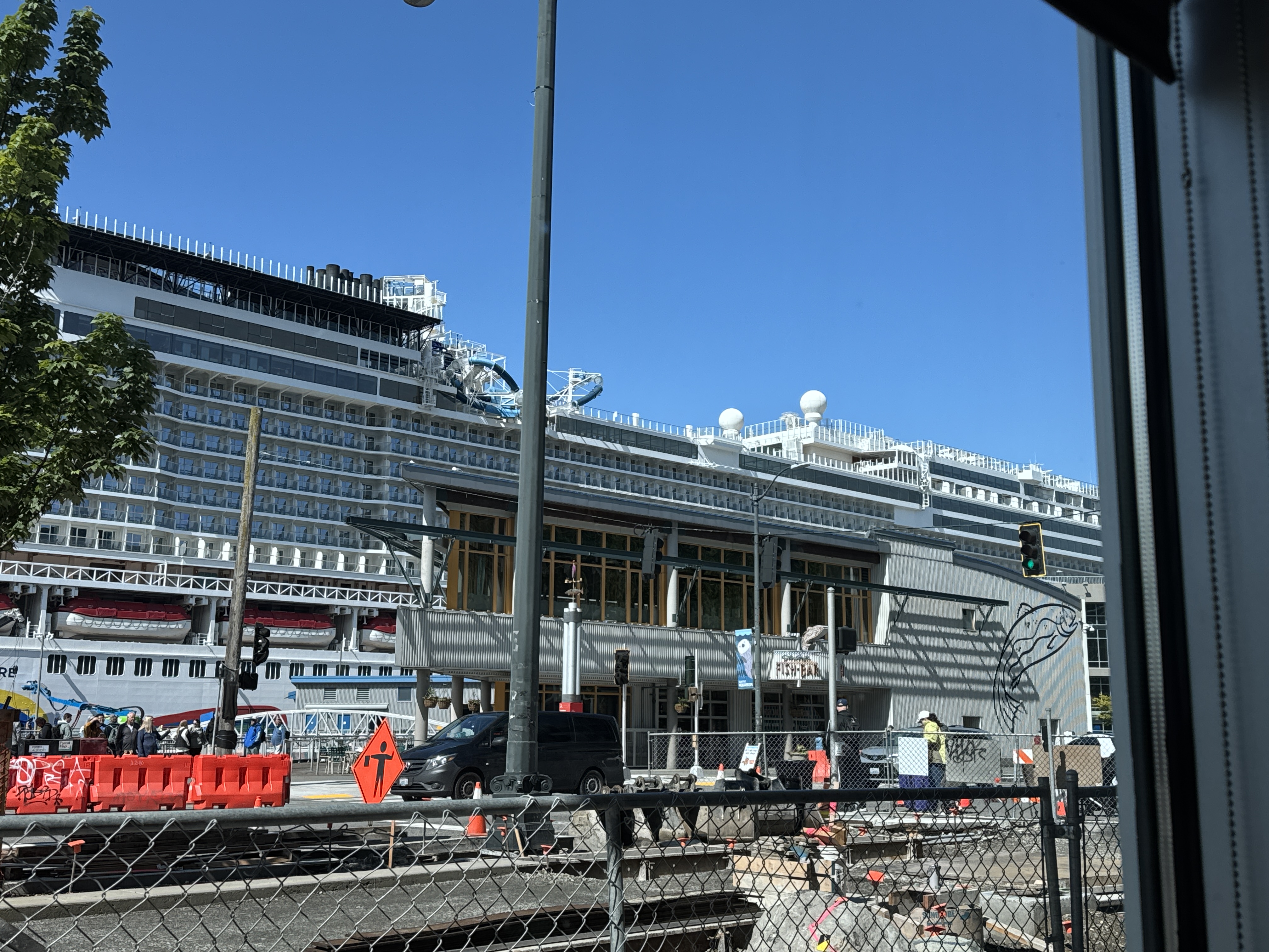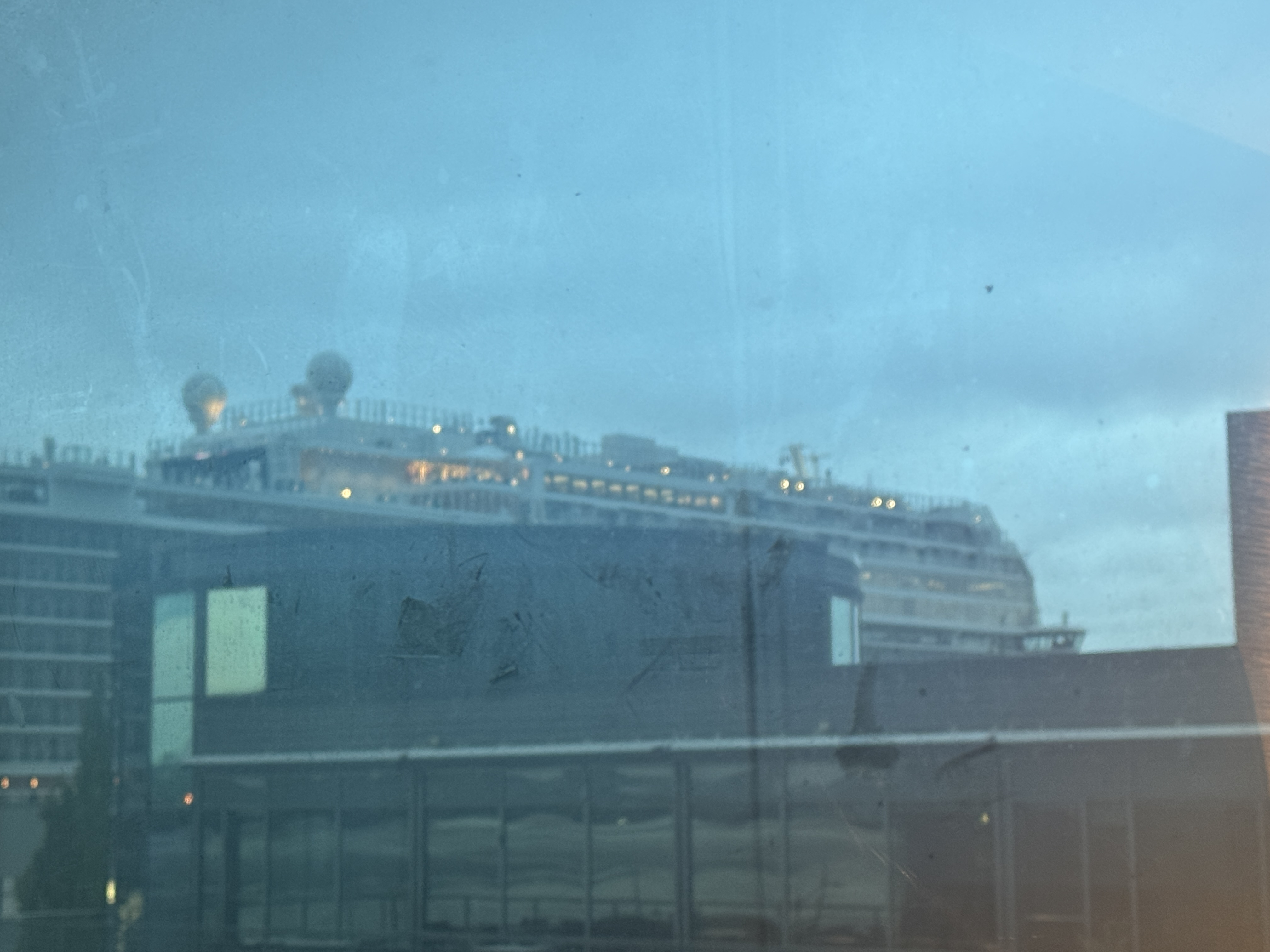 Up early even though we could have slept in since we didn’t have to board until Noon! Suitcases, backpacks and snack & coat bag are packed. First look at the Norwegian Encore!!! This was taken out of our room window.