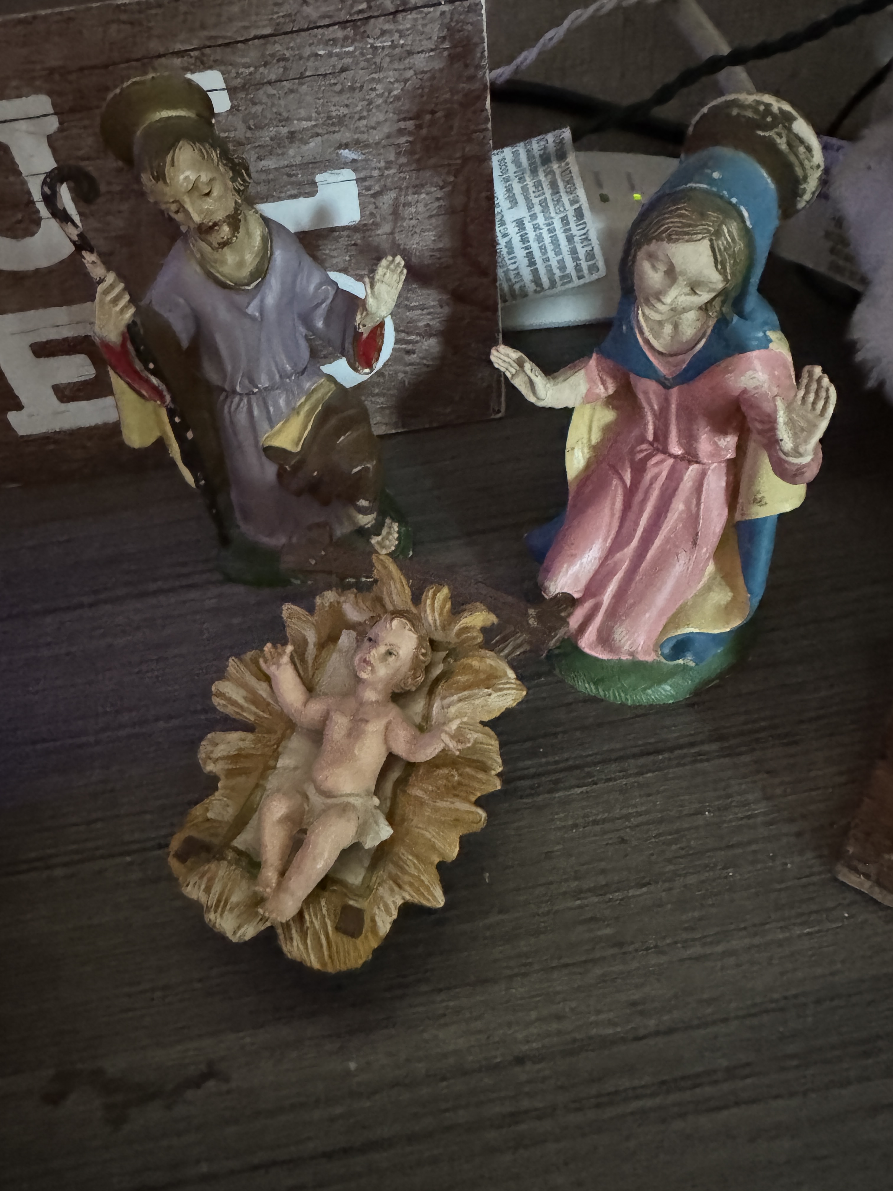 2. My mom visited from California for Christmas. While visiting she asked me about the little Nativity set on the top shelf in our living room. She asked me when did I steal it from her and I replied, “I didn’t steal it, I relocated it the day after our wedding when we were visiting you at the apartment.” She gasped and said, “I wondered where it had gone and just figured it had gotten lost when the decorations were put away that year.” We have put this little Nativity set front and center in every home we have lived in over the past 50 years.